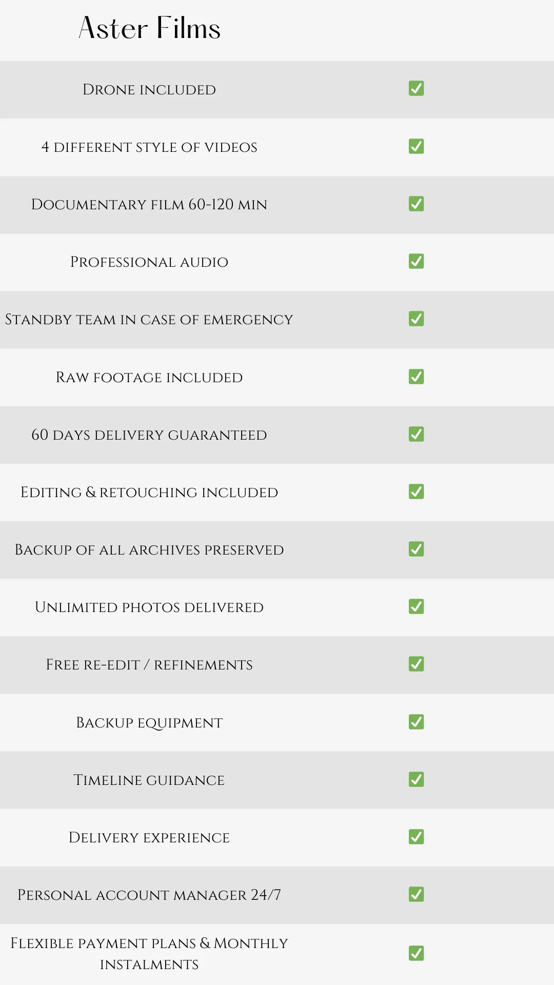 Couples choose Aster Films not simply for beautiful images, but for the confidence that everything is thoughtfully handled from start to finish. While many studios limit, upsell, or simplify their offering, we believe in a complete and refined experience — where every detail, from sound and storytelling to delivery and long-term preservation, is carefully considered. What you see in our work is not an exception, but a consistent standard — designed to give you not only beautiful results, but complete peace of mind.